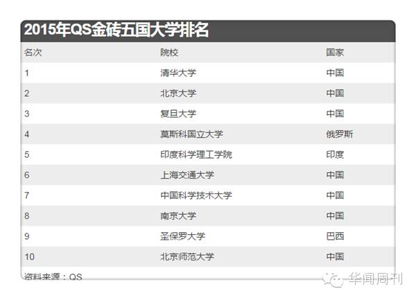 英国高等教育智库QS又发新榜单了。发表的调查指出,这回金砖五国(中国、俄罗斯、印度、巴西与南非),中国拥有最多优质大学。400强榜单里有110家中国大学上榜,而且前十名里面中国占了七个,前三名被清华、北大和复旦占据,后面紧跟着上海交大(第6名)、中国科技大学(第7名)、南京大学(第8名)和北师大(第10名)。