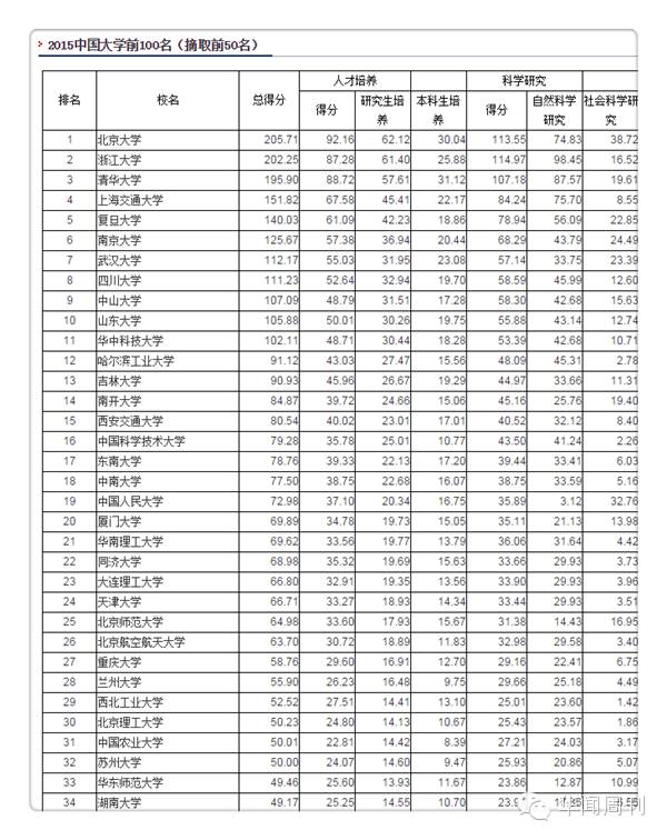 但民间也有不少机构发布大学排行榜。例如武书连的大学排行榜,其打分主要依据两部分:人才培养(本科生和研究生)和科学研究(自然科学和社会科学)。