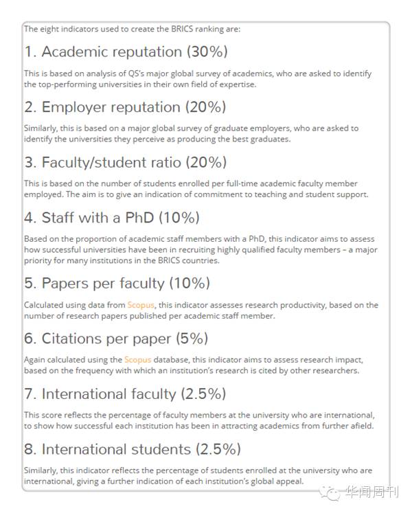 这份榜单从八个方面对金砖四国的大学进行了评价。分别是学术声誉(30%)、雇主评价(20%)、教职员工和学生比例(20%)、教职员工博士比例(10%)、人均发表论文数(10%)、论文引用率(5%)、国际教职比例(2.5%)和国际学生数(2.5%)。