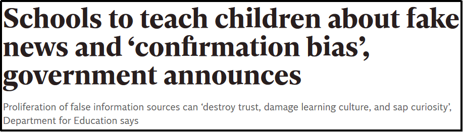 英国教育部的一份声明分析,假新闻的泛滥会“摧毁信任,破坏学习环境,抑制好奇心”。