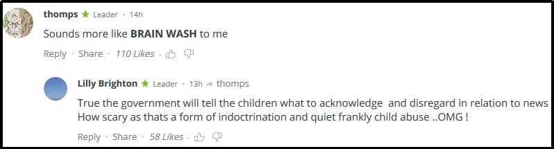有网友质疑英国政府此项措施是在向儿童从小灌输为政府服务的“正确”叙事,认为这是在“洗脑”(Brain Wash)。