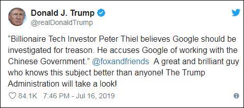 当地时间周二(7月16日),特朗普发推特说:“‘亿万富翁、科技业投资人彼得·泰尔相信谷歌应当以涉嫌叛国罪接受调查。他指控谷歌与中国政府合作’。他是最了解这一问题的了不起的聪明人!特朗普政府会看一看的!”