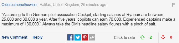 ▲英国网友认为瑞安航空公司飞行员收入不如媒体报道的那么高