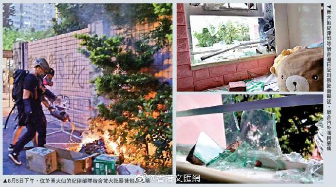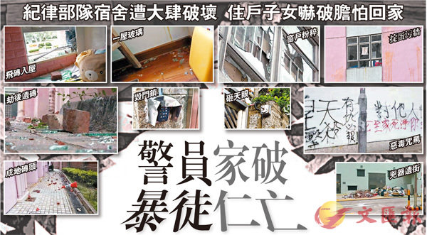 激进示威者横蛮无理,警察家人也受波及。警方在社交媒体发放短片,黄大仙纪律部队宿舍连日受到暴力示威者冲击后,宿舍内外满目疮痍:大闸密码锁被破坏;外墙遭喷上“祸必及妻儿”等仇恨字句;住户的玻璃窗被砖头砸烂,小孩房间的睡床亦布满玻璃碎片。