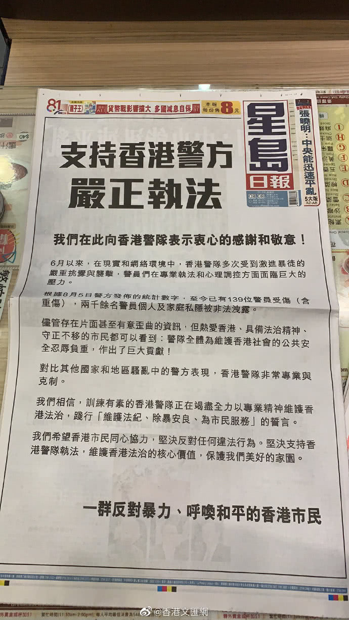 据香港文汇网8日报道,当天一封以此为题的“感谢信”以整版广告的方式刊登在香港《星岛日报》头版,其落款署名为“一群反对暴力、呼唤和平的香港市民”,而感谢信的主题是:“我们在此向香港警队表示衷心的感谢和敬意!”
