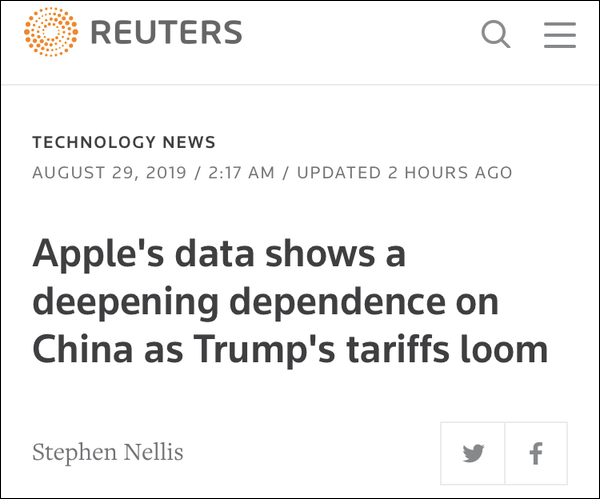 路透社评论称,很少有美国公司与中国的联系像苹果公司这么紧密,富士康、和硕、纬创等公司的代工厂在这里雇佣了数十万工人组装苹果设备,对中国的持续依赖使得苹果会很容易受到中美贸易局势及相关关税的影响。