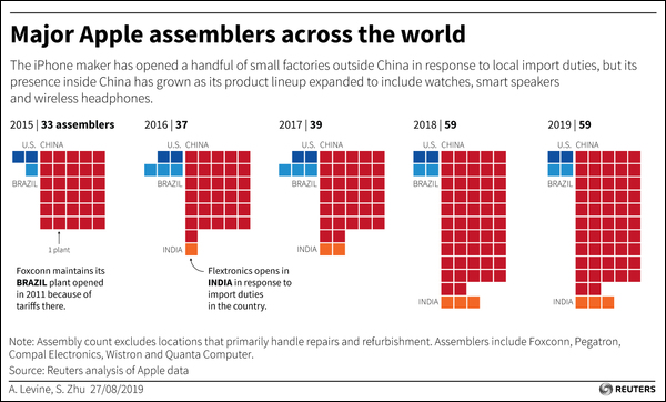 据路透社8月29日报道,苹果公司的供应链数据显示,在巴西和印度建厂并没有减少该公司对中国的依赖,其47.6%的供应商仍位于中国,中国“无法取代”。