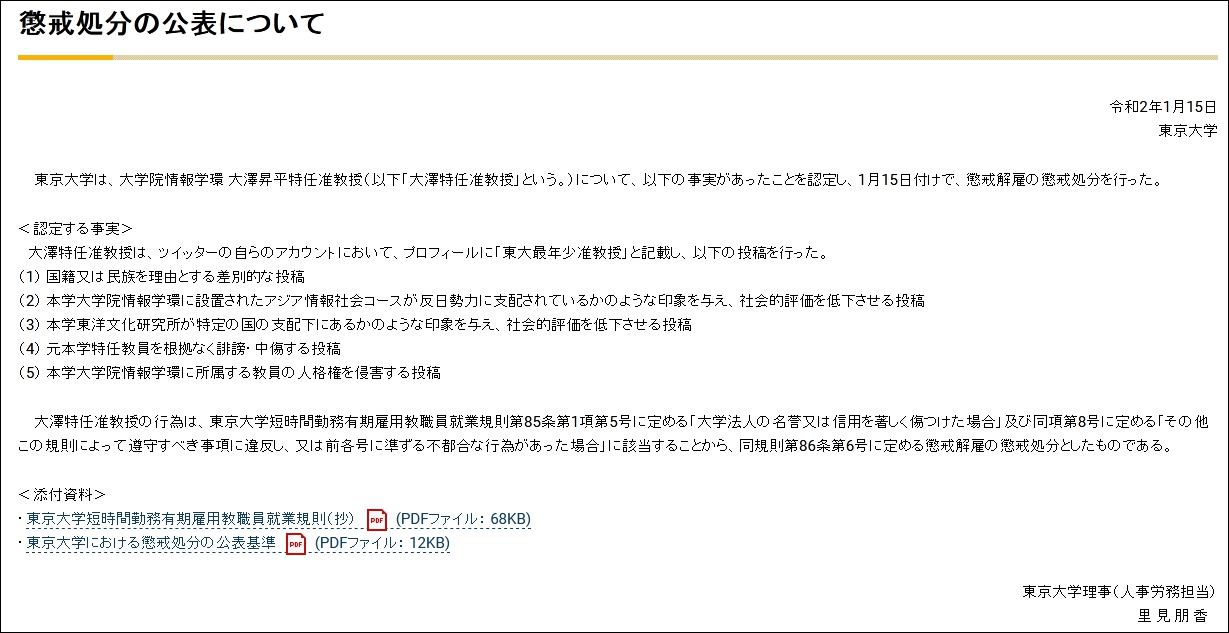 1月15日,东京大学在其官网上公布了解雇他的决定。
