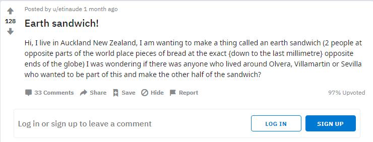 The first "Earth sandwich" is credited to the American artist Ze Frank, who organised two slices of baguette to be placed in New Zealand and Spain in 2006.