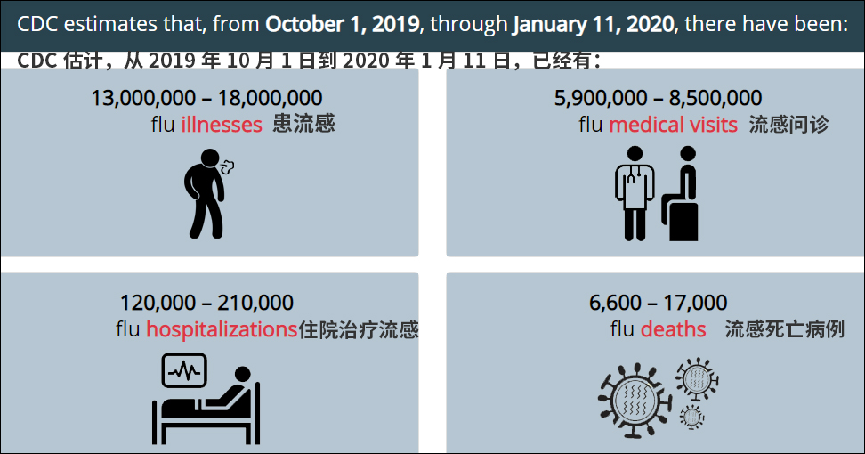 综合美国《国会山报》、CNN当地时间1月17日报道,美国疾病预防控制中心(CDC)估计,从去年9月29日开始的此次流感季中,美国至少有1300万例流感,12万人次住院治疗,导致6600人死亡。