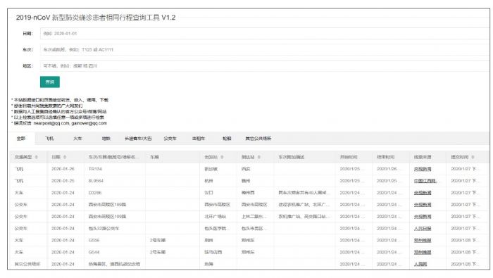 观察者网查询发现,截至目前,上述“查询工具”的记录共有自1月4日起至26日的232条,其中包括飞机、火车、地铁、长途客车/ 大巴、公交车、出租车、轮船,其他公共场所等出行方式和地点的相关信息。