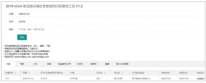 为了方便大家查询,“新型肺炎确诊患者相同行程查询工具”上线了:http://2019ncov.nosugartech.com/