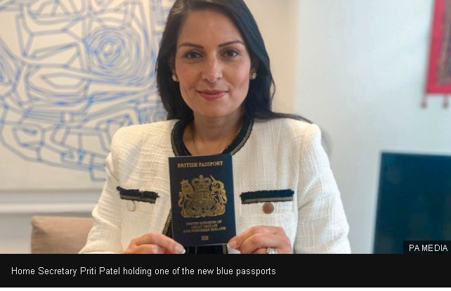 英国内政大臣普丽蒂·帕特尔手持新护照。(截图来自BBC)