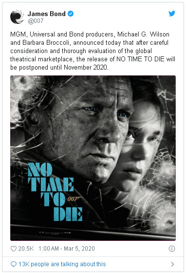 随着新型冠状病毒在全球的传播,国内外的电影纷纷撤档或宣布延期上映,原定于在4月上映的《007:无暇赴死》也宣布延期到11月上映,这是首部因疫情而推迟上映的好莱坞大片。