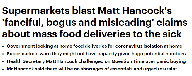 《每日邮报》则称,汉考克5日声称已和超市方面就送货上门进行沟通,但实际上有关谈判是6号才开始的。超市方面认为这一说法完全是幻想,面对激增的消费需求,他们并没有足够的车辆和司机,除非征用军队。