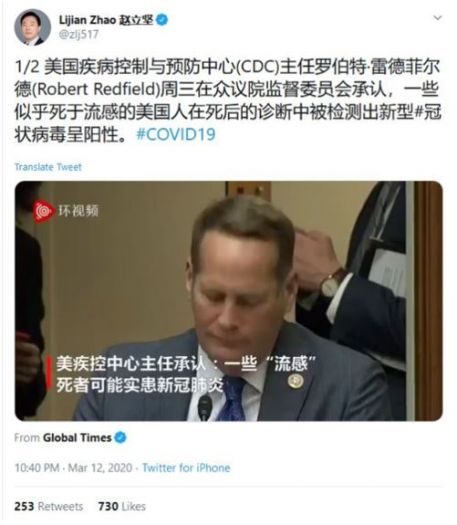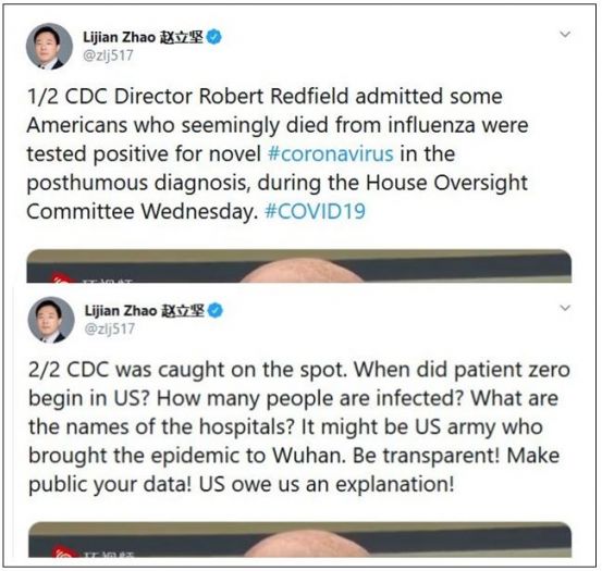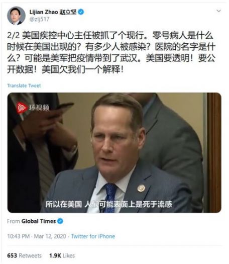 赵立坚在推文中表示:“美国疾控中心主任被抓了个现行。零号病人是什么时候在美国出现的?有多少人被感染?医院的名字是什么?可能是美军把疫情带到了武汉。美国要透明!要公开数据!美国欠我们一个解释!”