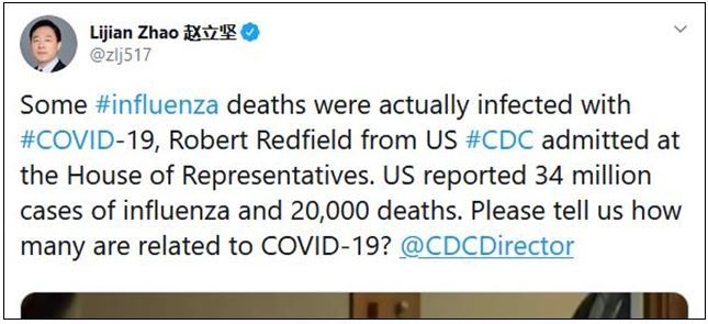 在另一条英文推文中,赵立坚还质疑说:美国称当季有3400万流感患者和2万人死亡。请告诉我们,这其中有多少人与新冠肺炎有关?