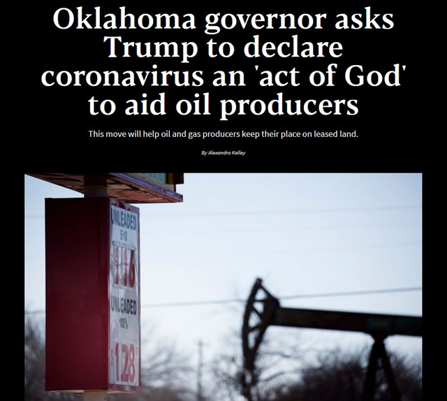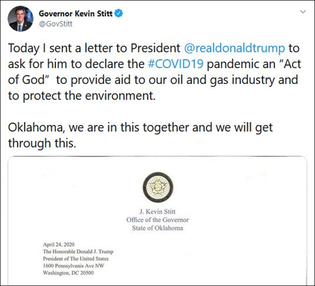 为了遏制油价下跌、促进减产,俄克拉荷马州州长凯文·斯蒂特(Kevin Stitt)呼吁特朗普,宣布新冠病毒大流行是“上帝所为”。