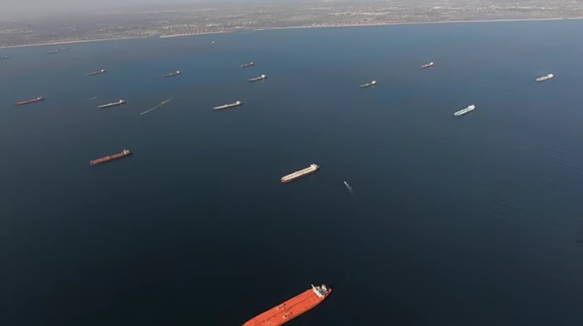 4月24日,在加州近岸等待卸货的油轮 视频截图
