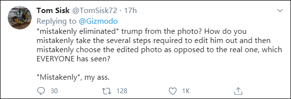 Gizmodo的推特报道下方,有网民留言称,“‘误删’了特朗普?你怎么错误地执行好几步编辑操作,把特朗普裁掉,然后再‘错误地’使用被编辑过的照片,而不是原图?“误删”你个头。”