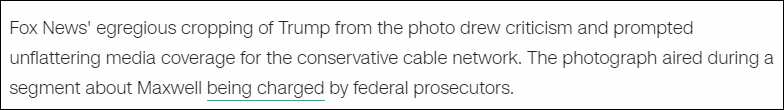 “本周日,7月5日,福克斯新闻的‘美国新闻总部’在报道吉斯莱恩·麦克斯韦时,把照片中的特朗普误删了(mistakenly eliminated)”福克斯新闻的一位发言人称,“我们对这个失误表示歉意。”