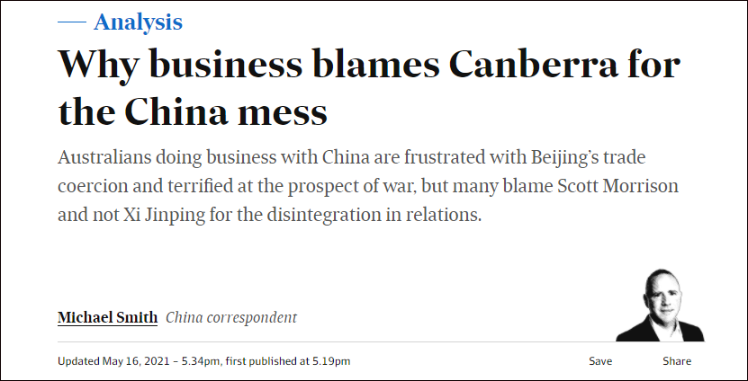 在澳大利亚《金融评论报》5月16日发表的一篇文章中,一些商届领袖直言,他们将中澳关系破裂归咎于莫里森政府,而不是中国。